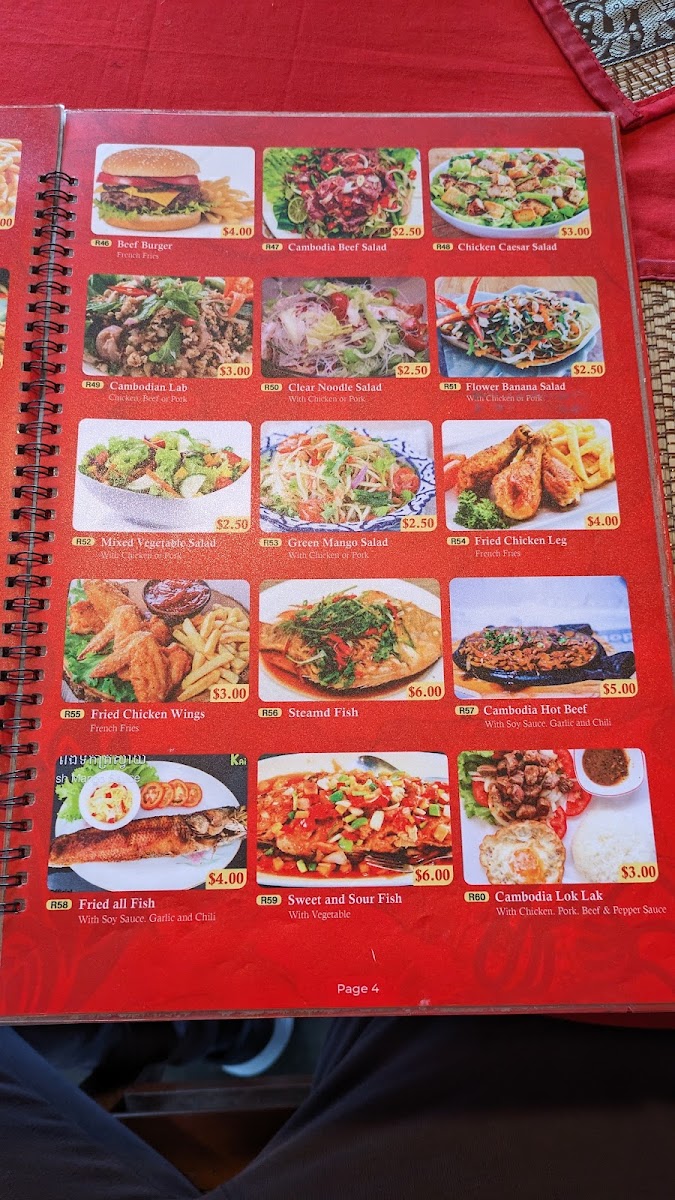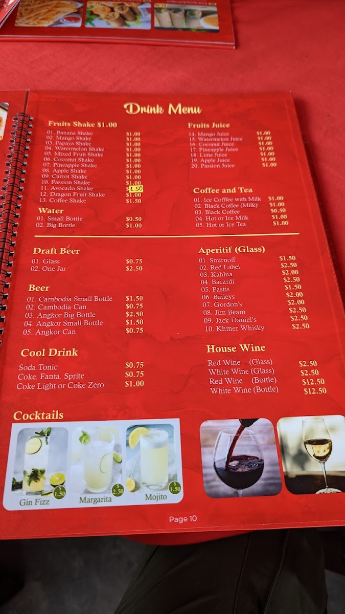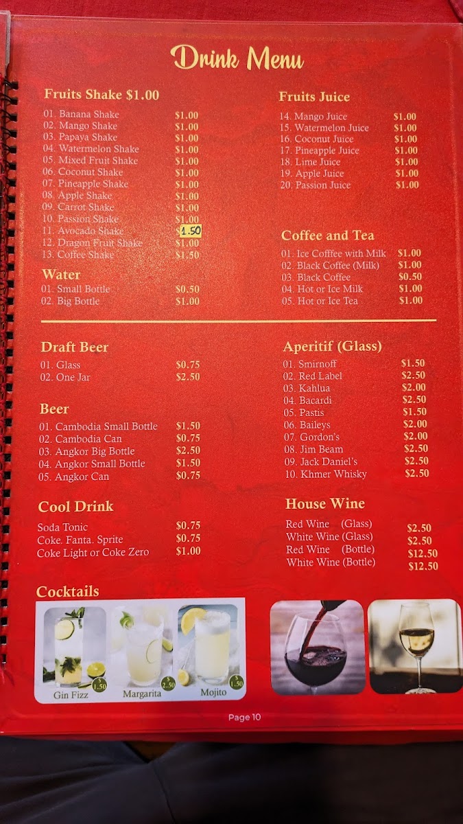 Overall, The Red And Green Curry Angkor Restaurant offers a diverse menu with something for everyone, from light snacks and beverages to satisfying main dishes. Whether you're in the mood for a refreshing drink, a hearty noodle dish, or a delicious dessert, this restaurant has you covered.