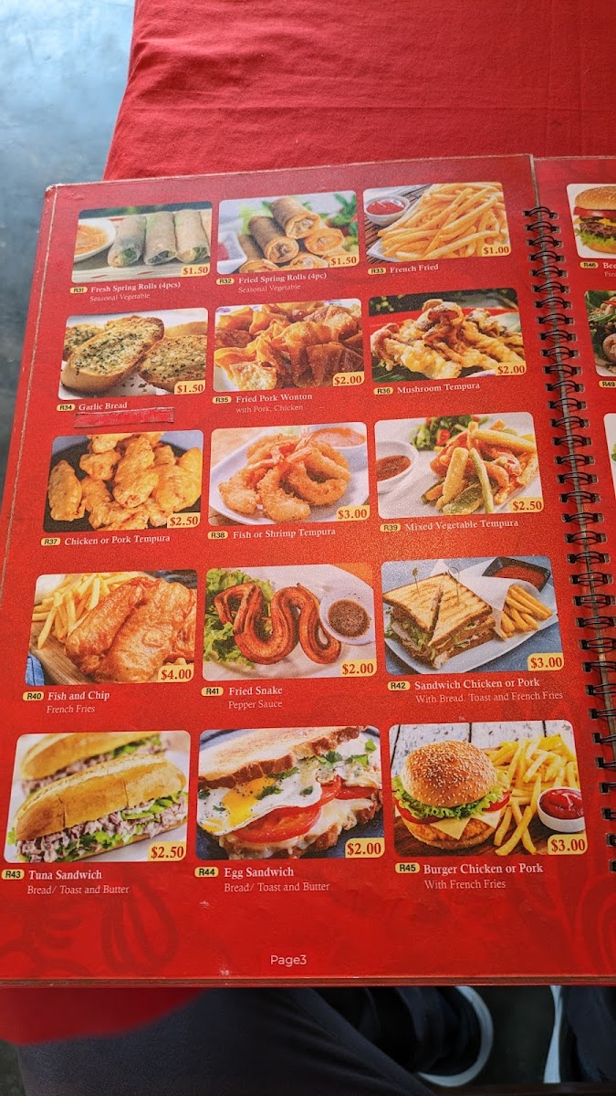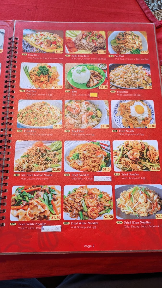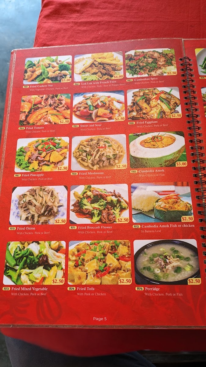For main courses, there’s a great selection of rice and noodle dishes. The Kapil Fried Rice (02) stands out with its distinct flavors, while the classic Fried Rice (01) is a comforting favorite. For a more exotic twist, try the Pak Kapao (03) or the Cambodian specialty Cambodia Lok Lak (18), which brings a unique local taste. If you prefer noodles, the menu offers several options such as the Fried Noodle (20), Fried Flat Rice Stick Noodle (25), or the Fried Glass Noodle (23), each offering a different texture and taste experience.