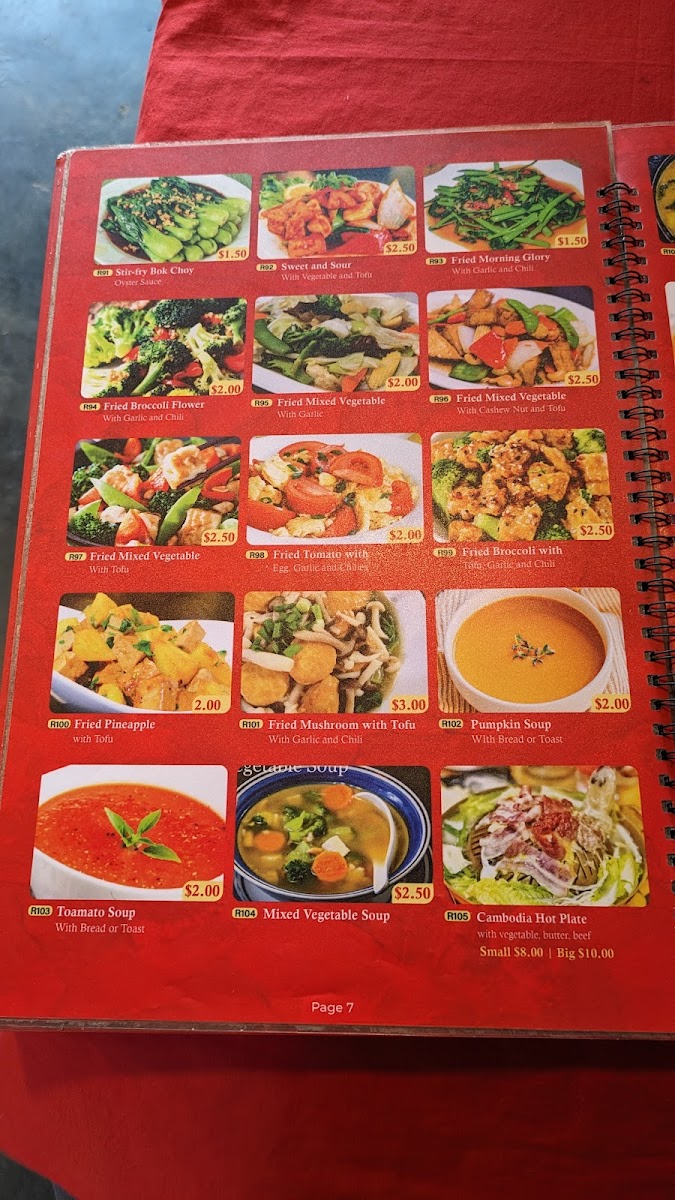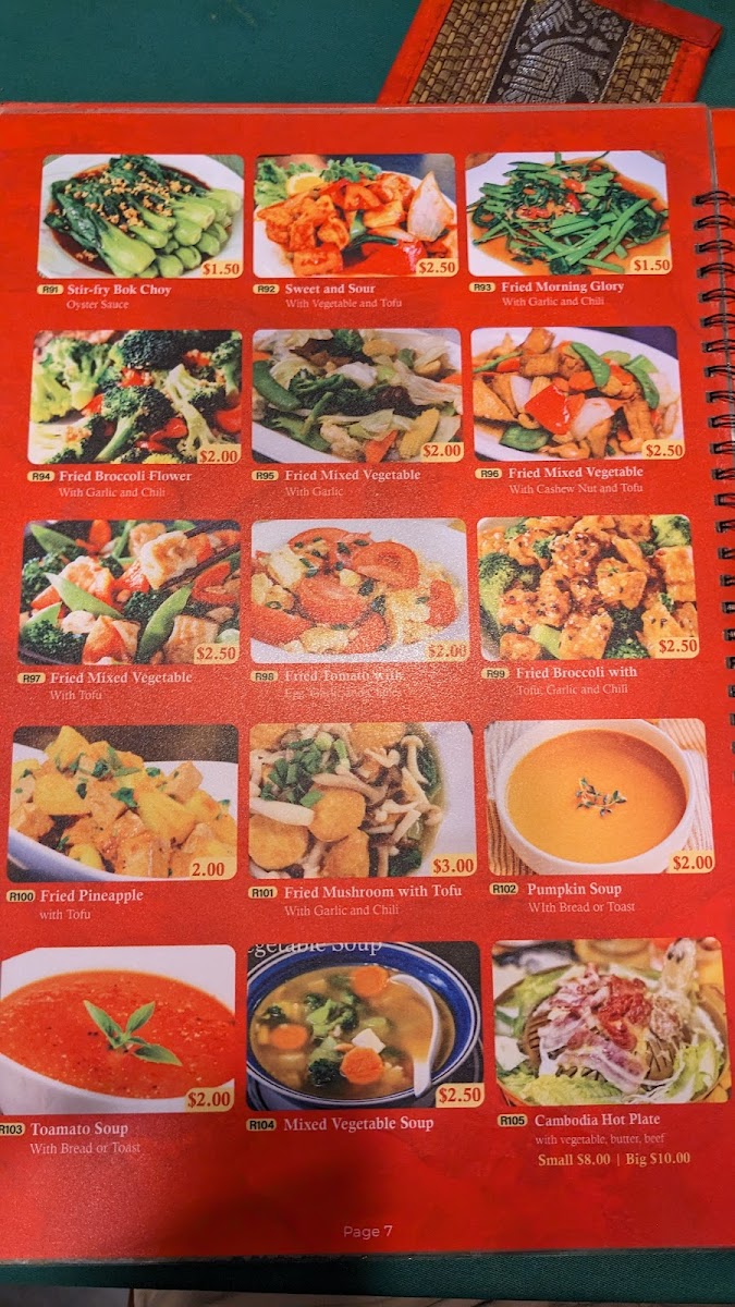 At The Red And Green Curry Angkor Restaurant, the menu offers a delightful variety of dishes that cater to various tastes. For appetizers, you can start with the crispy Mixed Vegetables Tempura (09), which provides a crunchy and flavorful experience, or the Fried Cashew Nut (34), which offers a savory, nutty bite. If you’re in the mood for something light yet flavorful, the Pumpkin Soup (42) might be the perfect choice.